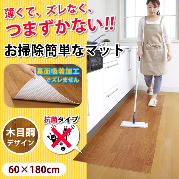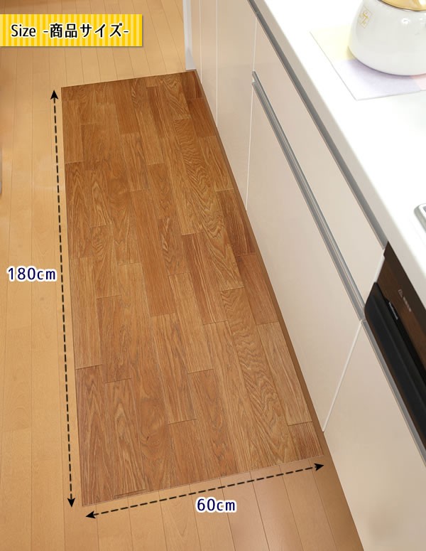 薄い・ズレない・つまずきにくい!!クッションフロアマットです。掃除機をかけても吸い上がらず、楽にお掃除できます。ハサミやカッターで、サイズに合わせてカットが可能。インテリアの邪魔にならない木目調デザイン♪ サイズ/60×180cm 重量/約1290g 素材・材質/表面:塩化ビニル樹脂 裏面:アクリル樹脂(カテキン入り) 仕様/床暖房対応(低温推奨) 製造国/日本 ※サプライヤー直送品 ご注文後3~4営業日後の出荷となります【商品名】キッチン快適♪吸着クッションフロアマット ウッド・KH-12 60×180cm
