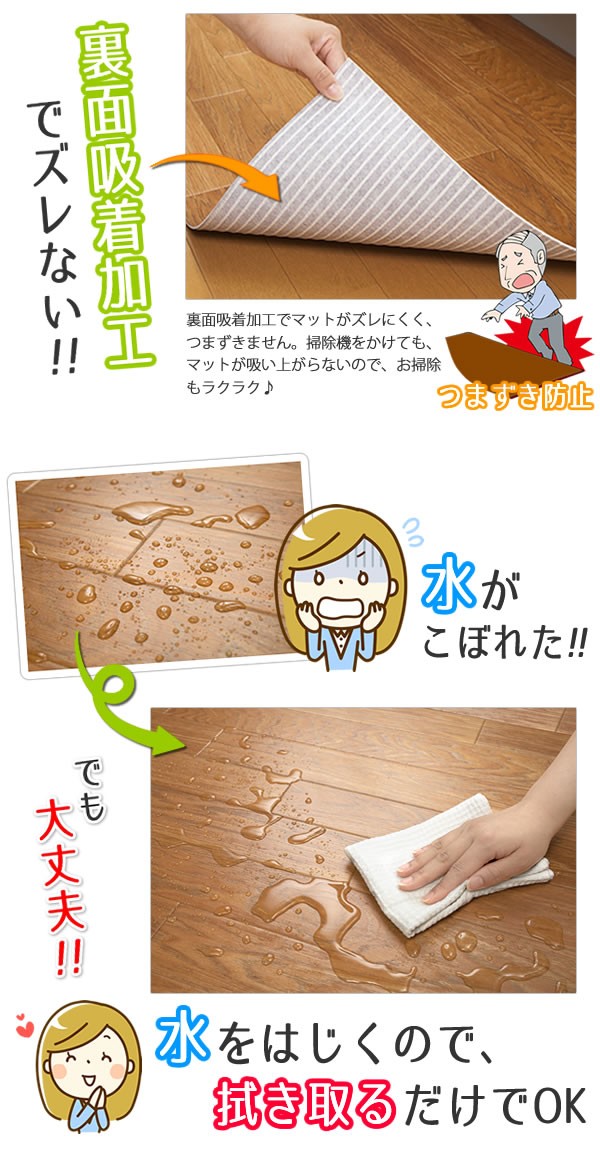 薄い・ズレない・つまずきにくい!!クッションフロアマットです。掃除機をかけても吸い上がらず、楽にお掃除できます。ハサミやカッターで、サイズに合わせてカットが可能。インテリアの邪魔にならない木目調デザイン♪
