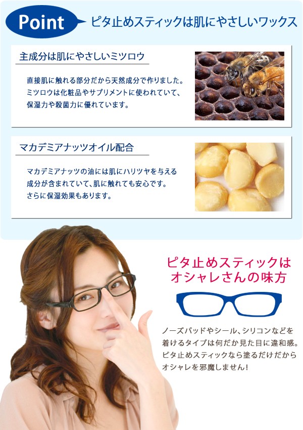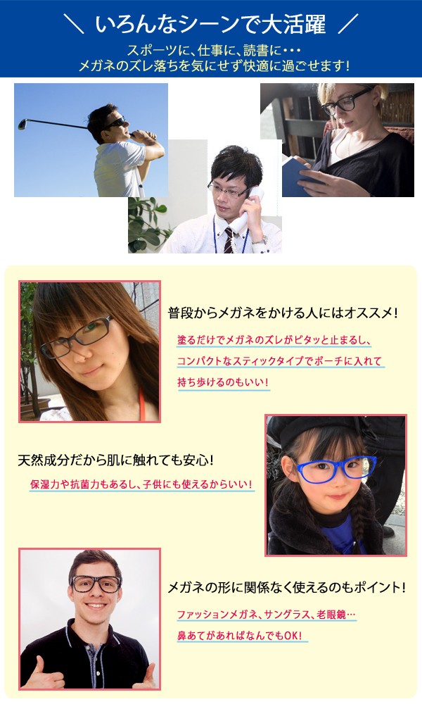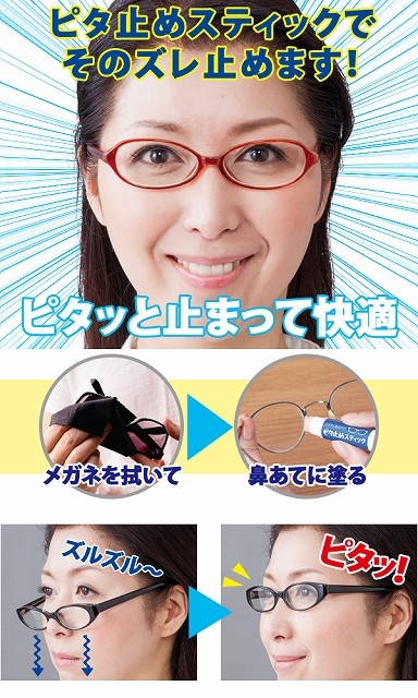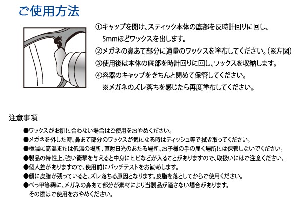 <h1>家事、趣味に快適!高価なメガネ、サングラス、老眼鏡にペタペタ貼らずにすむ、メガネのズレ防止を防ぐワックスです。ズレ落ち防止/滑り止め/ずり落ち/メガネ止め/鼻あて/鼻パッド</h1>