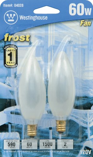 Product DescriptionWestinghouse 60 watt - 120 volt - B10 - Candelabra Screw (E12) Base - Frosted - Ceiling Fan - Torpedo Tip - Decor | Westinghouse Incandescent Light Bulb (2 pack) (60B10/F/FAN/CB/CD2 04028)0