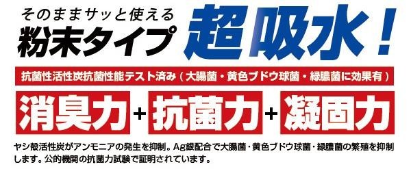 | 粉末タイプで高品質の超吸水ポリマーを使用した非常用トイレです。水を使わないので非常時に最適。スプーン1杯約7gで、約400ml(小便約1回分)の水分を凝固させることができます。消臭効果と抗菌効果のあるAg抗菌性活性炭を配合。使用後は可燃ゴミとして廃棄可能です。 |