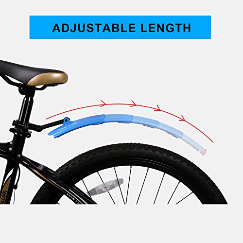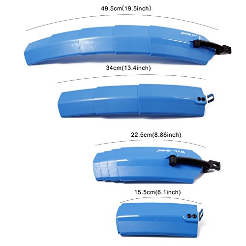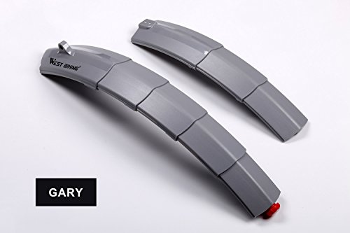 Specifications: Original Size: Front:15.5cm(6.1inch); Rear: 22.5cm(8.86inch) Extended Size: Front: 34cm(13.4inch); Rear: 49.5cm(19.5inch) Package size:24.5*8.5*7cm(?9.6*3.35*2.75inch) Gross Weight:390g/set Color:Black, Blue, Red, Orange, Green, Gray, White About Mudguards: West Biking Brand mudguards to make cycling in wet weather a more comfortable experience. Mudguards not only improve your comfort, but also improve the riding for other people when you are in a group, there is nothing worse than being sat behind someone without guards for a while. We list mudguards to suit road bikes, mtb, hybrids and a range of versatile clip-on guards from West Biking. As a front mudguard it's amazing at stopping the mud and spray that's thrown into your eyes from the back of the front wheel. An adjustable rear mudguard protects your linkages and shock from getting hammered effectively. 0