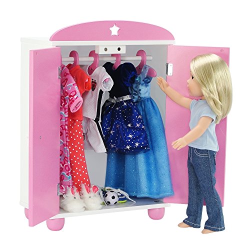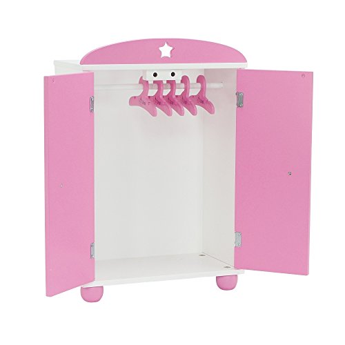 Store your 14-inch doll clothes in this beautiful pink and white armoire with lovely star details. Tons of space for all of your 14" doll clothes and even includes 5 hangers to get you started! This wardrobe requires easy assembly, instructions included. Made to fit American Girl Wellie Wishers, Hearts for Hearts Girls and other similarly sized 14 inch dolls. Check out other furniture in our Emily Rose Star themed collection by searching product numbers INS6000 and INS6002. Dimensions provided below are based on the fully assembled product. *Doll Not Included* *Doll Clothes Not Included*Feature
