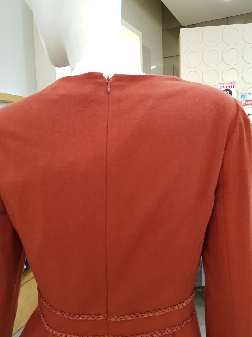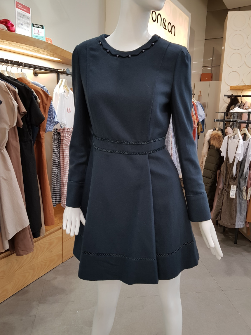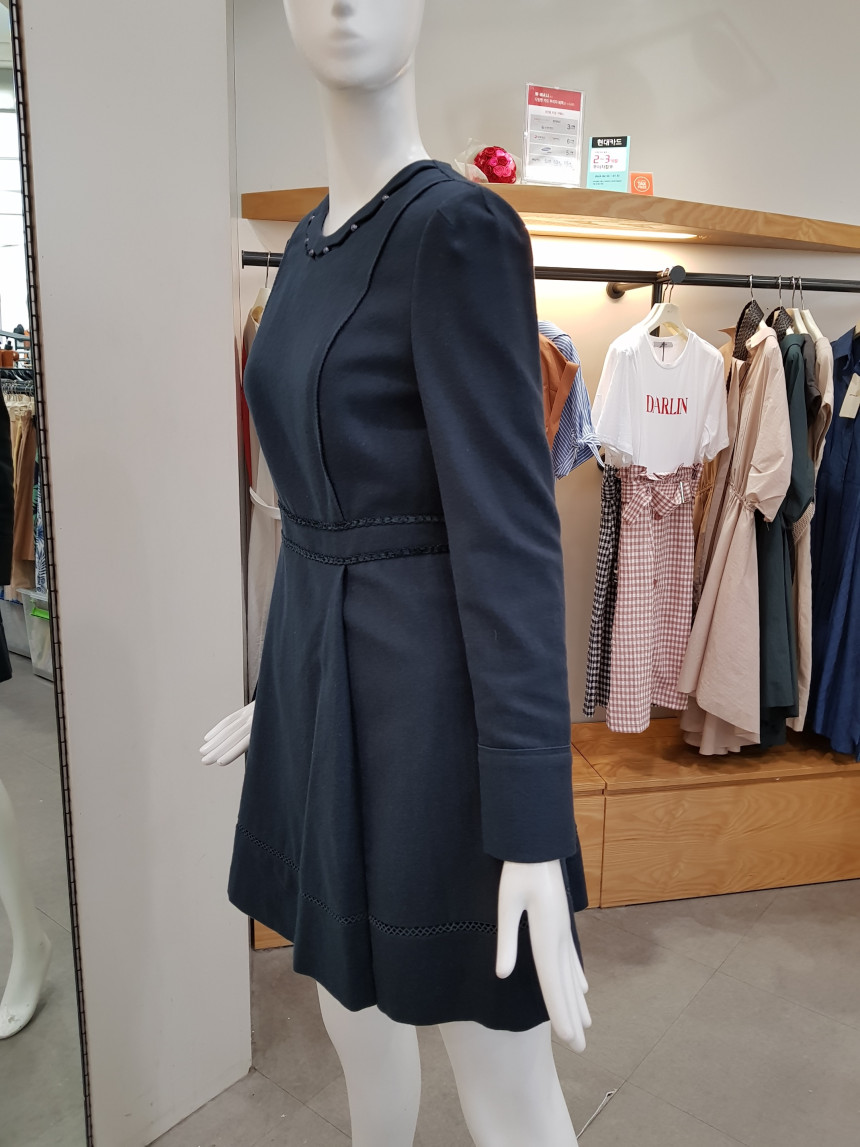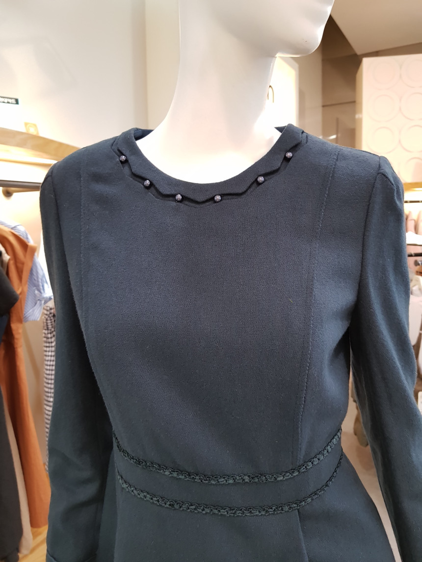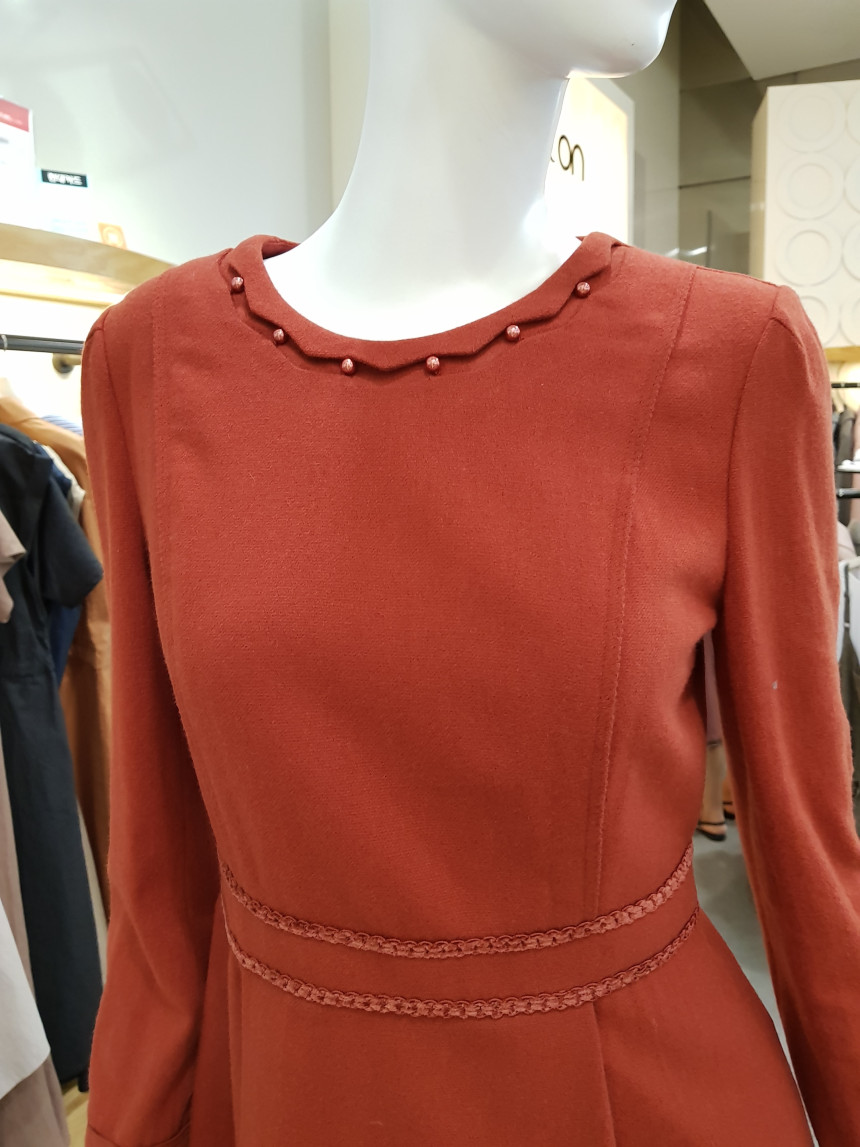 넥 라인을 비즈 장식으로 포인트를 준 모직 원피스에요^^