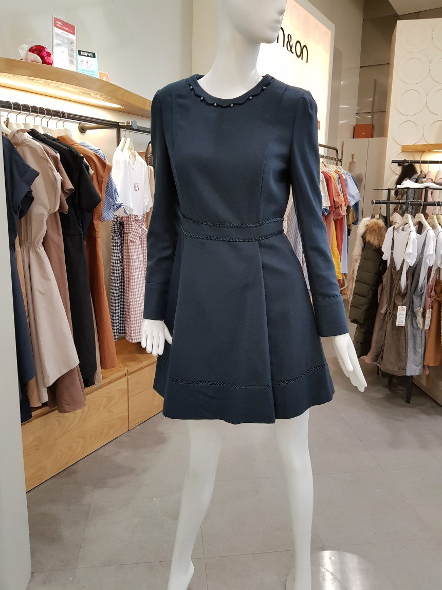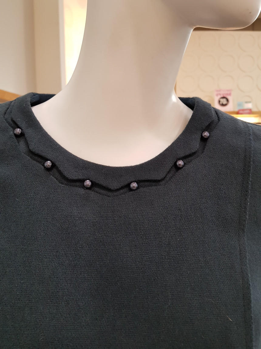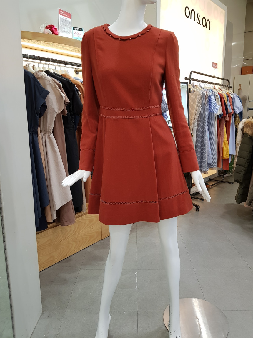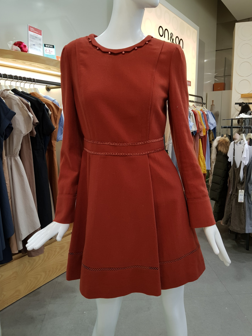 넥 라인을 비즈 장식으로 포인트를 준 모직 원피스에요^^