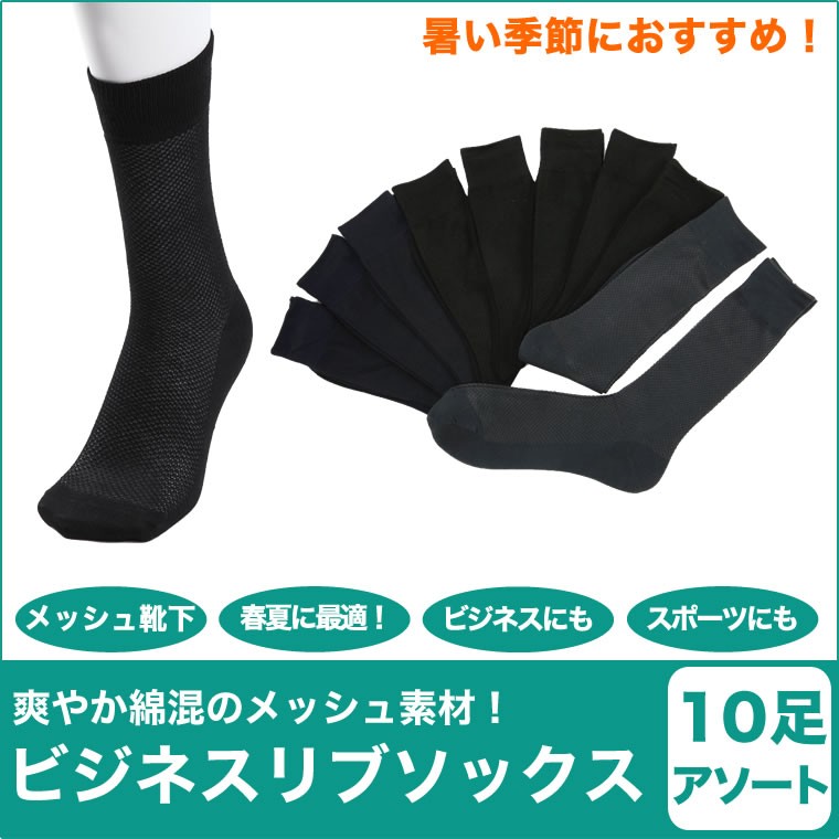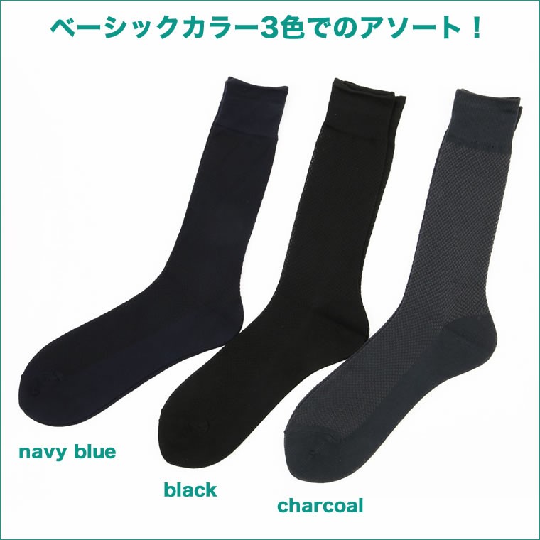 これからの暑い日にメッシュソックス10足セット♪黒・紺・チャコールのベーシックな3色で展開の10足アソートです。 シンプルな無地のメッシュソックス!暑い夏にも最適!。爽やか綿混のメッシュ素材で履き心地抜群!カジュアルスタイルからスポーツ時にも幅広く、ご使用いただけます。【サイズ】25~26cm 【素材】ポリエステル・綿・その他【カラー】黒・紺・チャコール