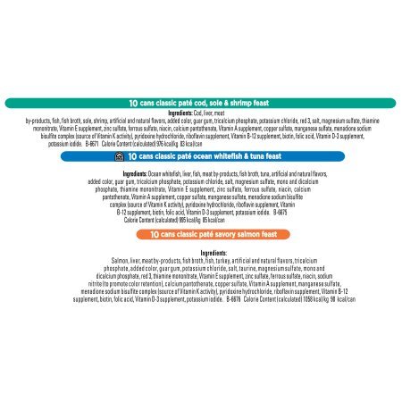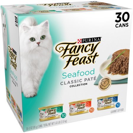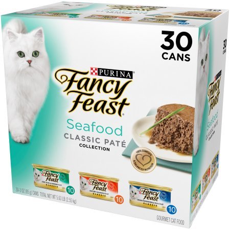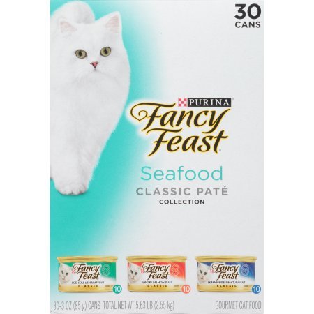 Finely ground and delightfully smooth, like pate.Contains: 10-3 oz. cans Cod, Sole & Shrimp Feast in Gravy; 10-3 oz. cans Savory Salmon Feast in Gravy, 10-3 oz. cans Ocean Whitefish & Tuna Feast in Gravy.Fancy Feast Classic Cod, Sole & Shrimp Feast is formulated to meet the nutritional levels established by the AAFCO Cat Food Nutrient Profiles for all life stages. Fancy Feast Classic Savory Salmon Feast is formulated to meet the nutritional levels established by the AAFCO Cat Food Nutrient Profiles for all life stages. Fancy Feast Classic Ocean Whitefish & Tuna Feast is formulated to meet the nutritional levels established by the AAFCO Cat Food Nutrient Profiles for all life stages. This special pack includes a variety of delicious Fancy Feast Classic seafood recipes to delight your cat including Cod, Sole & Shrimp Feast, Savory Salmon Feast, and Ocean Whitefish & Tuna Feast.Fancy Feast Classic entres are a true favorite among cats with a smooth, savory texture and an unmistakable taste and aroma.Suggested Daily FeedingFeed an averages size adult cat 1 can per 3-1/2 pounds of body weight daily. Feed up to twice this amount to kittens. Pregnant or nursing cats may require 2 to 4 times their normal feeding.