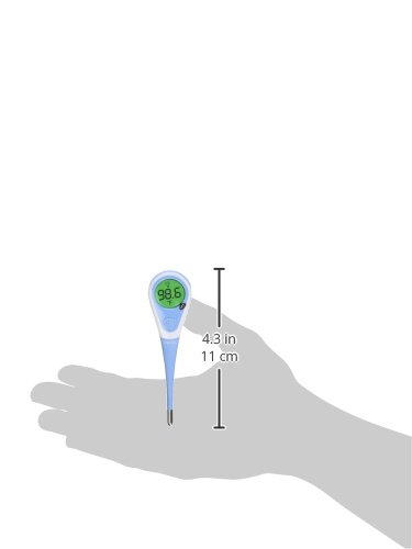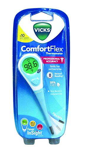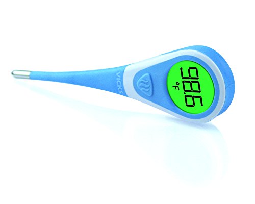 Amazon.com Working six times faster than standard thermometers, the Vicks 966 model completes a temperature reading in only ten seconds. In addition, this one features a flexible, soft tip for increased comfort, as well as a backlight glow that makes it easy to read in the dark. Like Vicks’ other models, it beeps when done, and offers professional accuracy to within /? 0.2 degrees Fahrenheit. A memory function allows a comparison between the current and previous reading. Mercury-free and with no glass to worry about, this digital thermometer makes a safe thermometer for the whole family. Because the thermometer can be used orally, rectally, or under the arm, five disposable probe covers are included to help prevent contamination between family members (more covers can be purchased in pharmacies). Waterproof for easy cleaning with soap and water or rubbing alcohol, the thermometer measures 5 by 1-1/8 inches, and includes a battery, open-ended protective case, and a lifetime warranty. --Ann Bieri 0