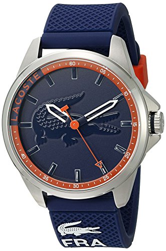 Product Description Stainless steel case. Silicone bracelet with buckle closure. Round face. Three-hand analog display with quartz movement. Blue dial features white-tone hands, navy hour markers, minute track, and Lacoste logo. Water resistant 50m. Imported. 0