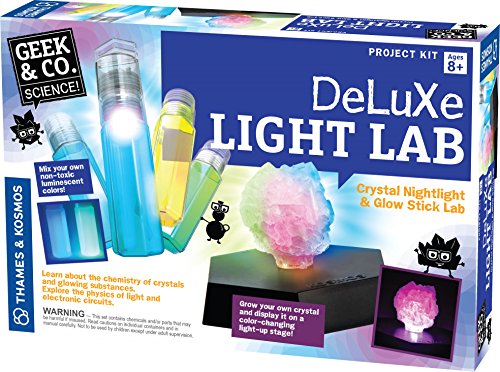 -. Feature : LIGHT LAB: This 2-in-1 science kit features step-by-step experiments that really shine! / TOYS THAT TEACH: Young chemists can create a trio of glow sticks using non-toxic phosphorescent substances and some basic ingredients from around the house. / GROW AND LEARN: Next, they will grow a spectacular crystal and illuminate it on a color-changing LED display platform. / FUN AND FUNCTIONAL: Watch as the crystal transforms into a mesmerizing rainbow-hued nightlight! / INCLUDES: UV LED cap with hook, cap without LED, four Hexagonal bottles and four clear stoppers, blue glow powder (Strontium aluminate, 3 grams), green glow powder (Strontium aluminate, 3 grams) and many more!