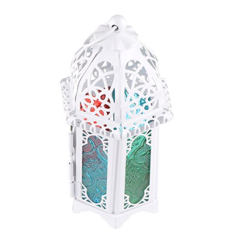 Hollow out pattern on the top and 6 red/blue/green glass on the side. Not only a candle holder, but also a gorgeous decoration itself. Great for weddings, parties, patio, events.