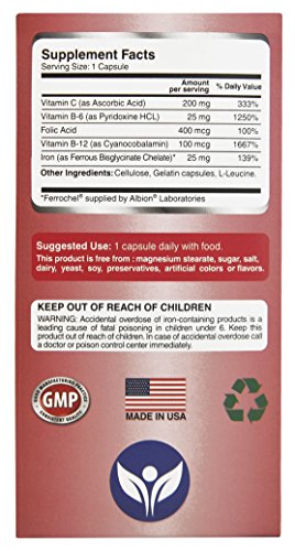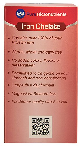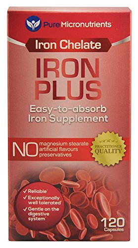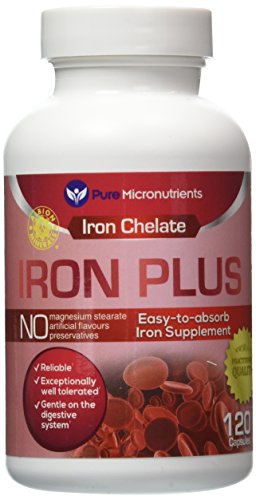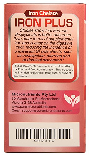 -. Binding : Health and Beauty -. Color : Red, White -. EAN : 0784672302173 -. Feature : Made in USA. Practitioner Quality Natural Iron Supplement formula with Vitamin C, B6, 12 & folic acid. Clinically Proven to be a Highly Absorbable form of iron†. / Iron Chelate Supplement (iron bisglycinate) is a small, easy to swallow, gentle ferrous iron / NO Magnesium Stearate, Dye, Preservatives or artificial colors, gluten, yeast, starch or dairy and is NON-GMO / Perfect iron supplement for women, men, pregnancy/ lactation & elderly / Essential for healthy heart & blood cell formation, immune system, reproductive health, energy & cognitive function, heart palpitations and healthy skin & eyes†. Customer Promise - 60 day MONEY BACK GUARANTEE! -. Label : Pure Micronutrients -. LegalDisclaimer : We recommend that you do not solely rely on the information presented and that you always read labels, warnings, and directions before using or consuming a product. For additional information about a product, please contact the manufacturer. Content on this site is for reference purposes and is not intended to substitute for advice given by a physician, pharmacist, or other licensed health-care professional. You should not use this information as self-diagnosis or for treating a health problem or disease. Contact your health-care provider immediately if you suspect that you have a medical problem. †Information and statements regarding dietary supplements have not been evaluated by the Food and Drug Administration and are not intended to diagnose, treat, cure, or prevent any disease or health condition. Amazon.com assumes no liability for inaccuracies or misstatements about products. -. Manufacturer : Pure Micronutrients -. PackageQuantity : 1 -. ProductGroup : Health and Beauty -. ProductTypeName : HEALTH_PERSONAL_CARE -. Publisher : Pure Micronutrients -. Studio : Pure Micronutrients -. Title : Iron Plus: Natural Iron Supplement (Iron Chelate, Bisglycinate) 25mg, + Vitamin C, B6, B12, Folic Acid, 120 Count -. UPC : 784672302173