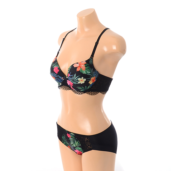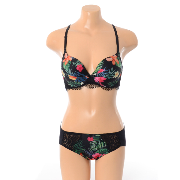 블랙 컬러 바탕에 하와이안 플라워 프린트를 사용한 화려한 스타일의 몰드브라 햄팬티세트입니다.
