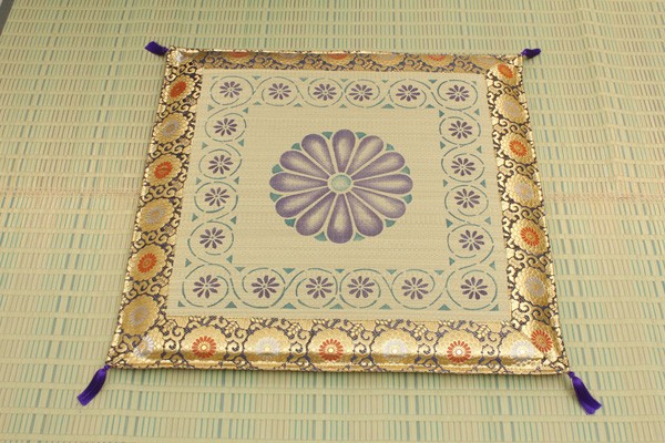 【商品名】 純国産/日本製 友禅捺染 い草御前(仏前)座布団 『正倉院』 約70×70cm 【ジャンル・特徴】 お盆準備やご仏壇を購入された方に。いぐさマット 冷感マット ■サイズ・色違い・関連商品■座布団 70×70cm[当ページ]■ござ 88×180cm関連商品の検索結果一覧はこちら お盆の準備や、新しくご仏壇をご購入された方にお勧めの御前座布団です。ギフトケースでお届けを致しますので、贈り物にもピッタリです。側地はメセキ織りという技法で柔らかい肌感触に仕上げました。国産(九州産)のい草を使用しています。一本一本が太く、表皮が厚く繊維がキメ細かいので弾力性があり、耐久性に優れています。い草には空気の自然浄化作用、湿度の調節作用などがあります。また汚れにくく、使用するうちに黄金色に変化し味が出ます。い草に青森ヒバ加工を施しています(抗菌、防臭効果)。中材にはポリエステルわたを凝縮して仕上げた、固わたを40mm使用しています。程良い弾力性があり、ヘタリにくいのが特徴です。■商品スペックサイズ:約70×70cm素材:側地=い草(九州産) ※メセキ織 ヘリ=ポリエステル95%、レーヨン5