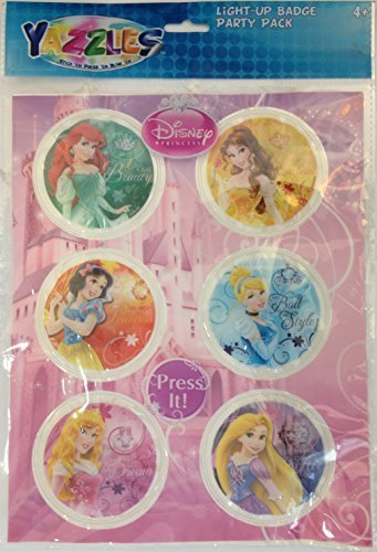 Six stick-on badges, each features a different Disney princess! Each 3-inch-diameter badge blinks multi-colored lights when you press on it! Make fabulous party favors!