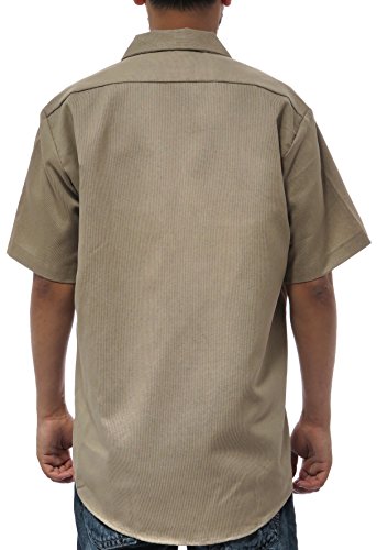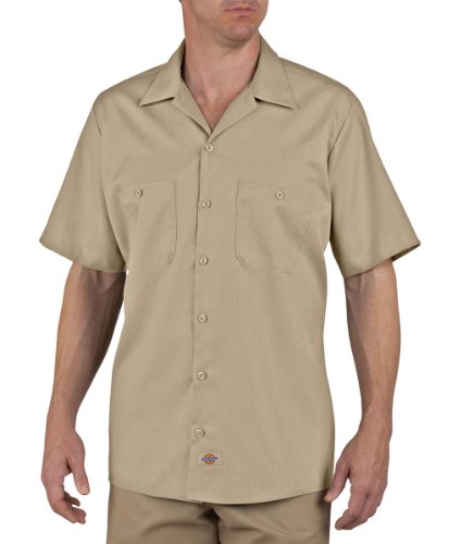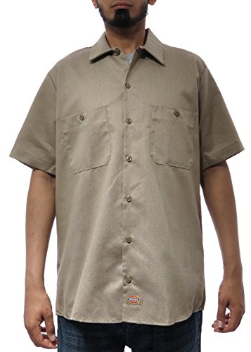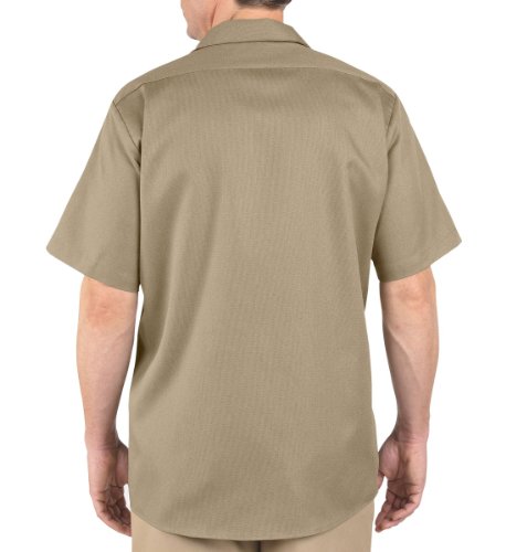 This Dickies LS536KH khaki short-sleeved patterned shirt has a button-up front and the Dickies logo on the left pocket and at the bottom of the button placket. It is made of 4.25-oz. poplin fabric and is 65% polyester / 35% cotton. The shirt has a stain release finish for releasing stains during laundering. It has mitered front pockets with a pencil division on the left pocket. It has a lined two-piece collar with permanent stays and button closure. This shirt is fade-resistant. Imported.