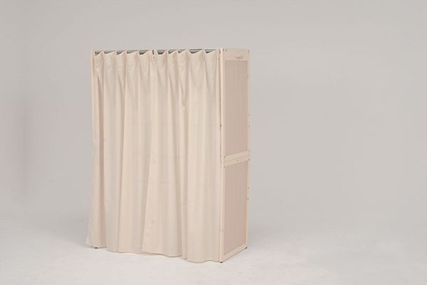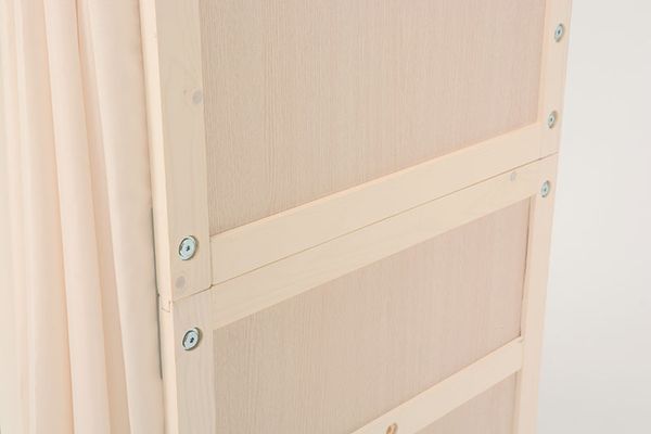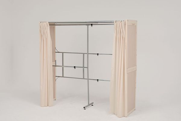 ●スペースに合わせて伸縮可能な木製クローゼットハンガー。カーテン付き。