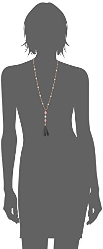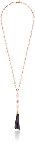 Beaded Y-necklace with vibrant pink beads, white faux pearl accents, and a gray faux leather tassel.