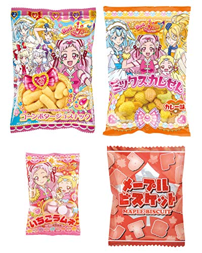 原材料:【ビスケット(メープルビスケット)】小麦粉、砂糖、植物油脂、ショートニング、メープルシュガー、コーンスターチ、加糖脱脂練乳、食塩、膨脹剤、香料、乳化剤(大豆由来)【スナック菓子(プリキュアミックスカレせん・カレー味)】小麦粉、植物油脂、でん粉、砂糖、食塩、香辛料、コーンパウダー、ホタテエキス、昆布エキス、えび粉、あおさ、カツオエキス、膨脹剤、調味料(アミノ酸等)、着色料(クチナシ、アナトー、ベニコウジ)、香辛料抽出物【スナック菓子(プリキュアコーンポタージュスナック)】コーン(遺伝子組換えでない)、植物油脂、砂糖、食塩、ホエイパウダー、香辛料、チーズパウダー、蛋白加水分解物、コーンパウダー、酵母エキスパウダー、調味料(アミノ酸等)、香料、微粒酸化ケイ素、甘味料(ステビア)、(原材料の一部に乳、大豆を含む)【清涼菓子(プリキュアいちごラムネ)】ぶどう糖、コーンスターチ(遺伝子組換えでない)、でん粉分解物、酸味料、香料、着色料(アントシアニン)