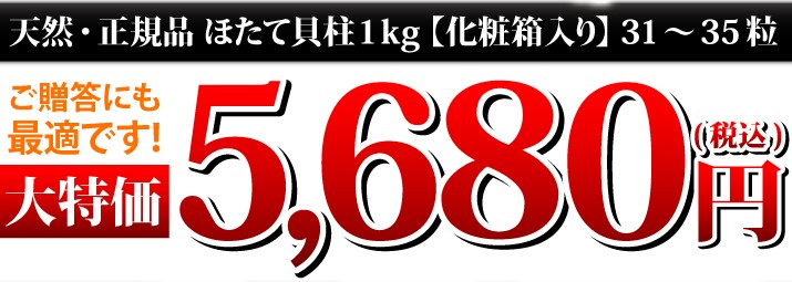 | 商品内容 | 天然ほたて貝柱刺身用 1kg(約31~35個)化粧箱入 生産地:北海道/北海道・オホーツク海 |