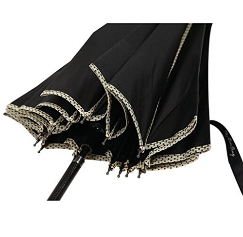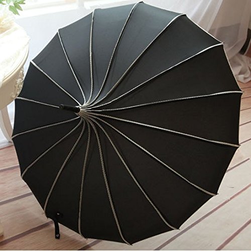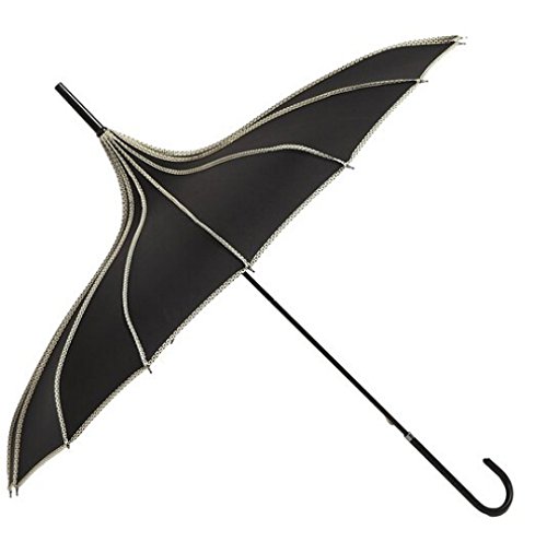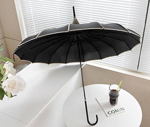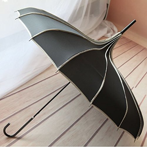 -. Feature : Slim skeleton and strong metal ribs / PG cloth canopy features a peaked pagoda shape / Protects you from downpours and UV rays alike / Easy-to-hold hooked handle / Dimension:35 inches(diameter)*32.5 inches(L)