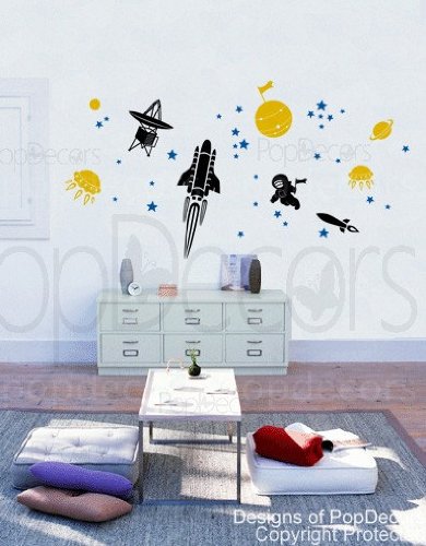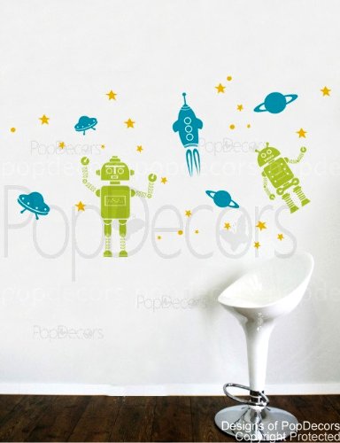 High quality wall art product, creates hand painted look on your wall. [Size] Whole image on the wall: 65"(165cm)W * 39"(100cm)H (Each parts will come separately, so the whole size on the wall is varied with your arrangement.)Big robot: 23"HAnother robot: 17"H Default Colors: (As shown in the first image)Robots: Lime tree greenPlanet, Rocket and UFO: Turquoise blueStar: Yellow Decals can be applied on smooth and clean surface (walls, glass, doors etc). Do not use on textured walls (orange, sandy and grainy), fresh paint (less than 14 days) and low VOC (Volatile organic compound) paint. Returns are accepted within 60 days of purchase. Standard Amazon restocking fee applies. Returned item needs to be in unused/good condition. Original designs by Popdecors. 2010 Copyrights Protected.Feature