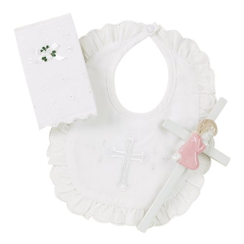 Elegant Baby Girl's Christening Gift Set Includes 100% Cotton Bib, Wall Hanging Porcelain Cross & Bible. Gift Boxed