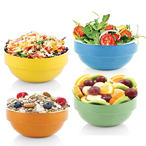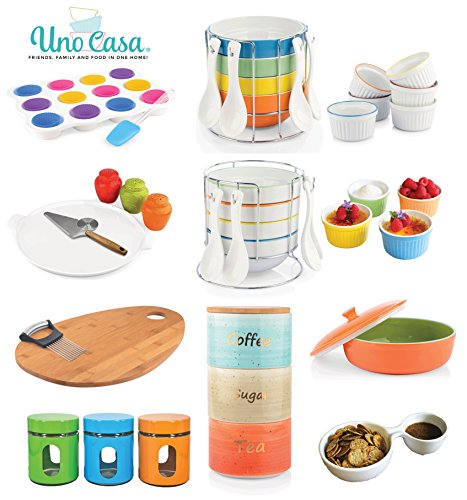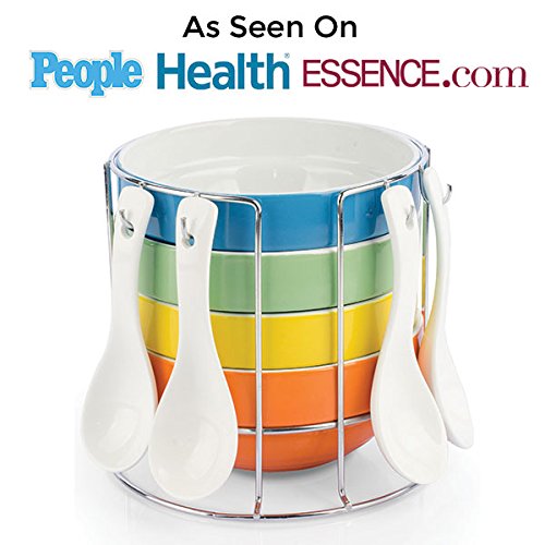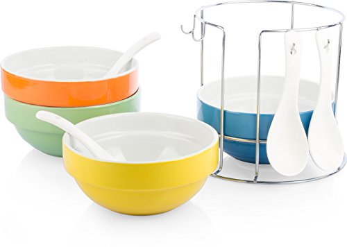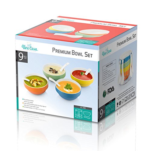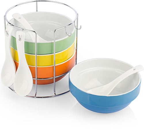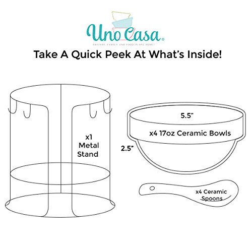 What you serve matters just as much as what recipes you use. Food that's presented in beautiful bowls with attractive spoons makes any meal a special one, and the Uno Casa Stackable Bowl Set makes serving in an appetizing way oh so easy! In this handsomely designed and durably crafted set of stackable bowls, you'll find 1 x Wire metal bowl stand with a highly polished finish, 4 x Sleek white spoons with holes in the handles for hanging, 4 x 17oz. Large bowls that are 5.5" in diameter and 2.5" deep. The serving bowls included in this serving set can be used for any meal whether you're just serving your family or entertaining guests! They're the perfect choice of an oatmeal bowl for breakfast, Bowls for chilli and soups, Appetizer bowls for dips and salsas, Dinner bowls for stews and curries, Dessert bowls for ice cream, puddings, trifles and more. When you're finished with the meal, you can quickly hand wash the soup bowls and spoons/simply place it in the dishwasher for simple clean-up. They're durable stoneware ensures that they'll stand the test of time and provide you with many years of stylish dining. After the set is dry, stack them up in the metal bowl stand, hang the spoons from the hooks, and you're ready to serve again next time. The colorful finishes of the orange, green, yellow and blue serving bowls make this appetizer serving set attractive enough to store right on the counter top if you wish! A perfect gift for a Mother's Day, a birthday or any occasion, the Uno Casa Bowl Set is backed by a 90 day satisfaction guarantee and is truly the best set of soup bowls and dessert bowls you'll find on Amazon! Order your bowl set today!Feature