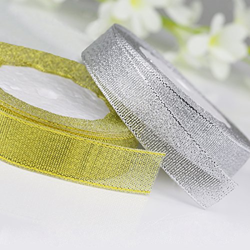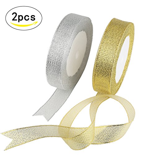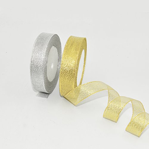 Organza Ribbon,KAKOO 2 Pack 25 Yard 20mm Wide Glitter Trimmings Decorative Ribbons for Gift Wrapping (gold&silver)