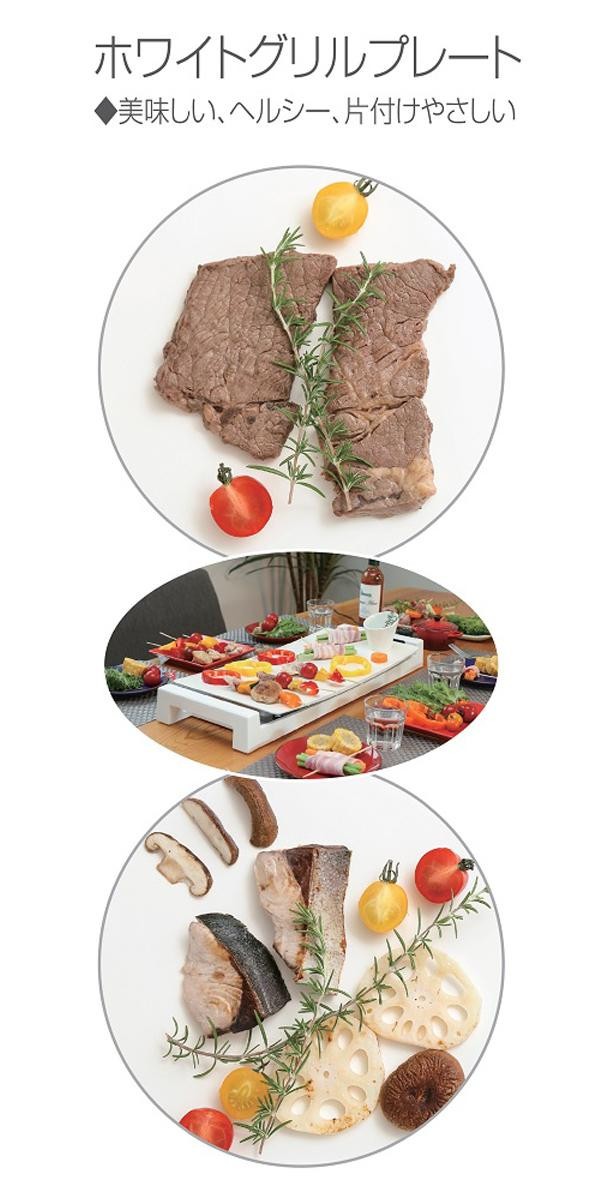 プレート中央の穴から余分な油が落ちます。食材から出た油だけで調理可能なのでとってもヘルシー。軽くて丈夫なので、お手入れ簡単♪鮮やかなホワイトセラミックコーティングされたアルミ合金をプレートに採用しています。 |