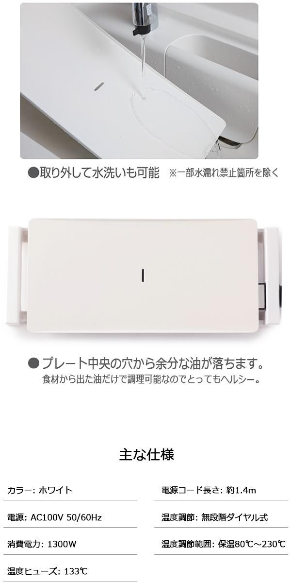 | プレート中央の穴から余分な油が落ちます。食材から出た油だけで調理可能なのでとってもヘルシー。軽くて丈夫なので、お手入れ簡単♪鮮やかなホワイトセラミックコーティングされたアルミ合金をプレートに採用しています。 |