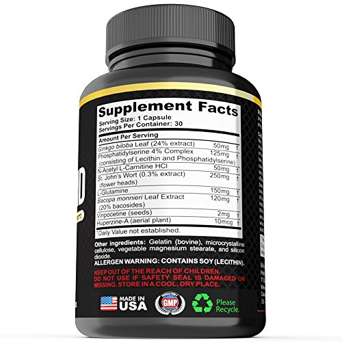 -. Title : Natural Brain Supplement by Elite Mind, Complete Nootropic Brain Booster Formula, With Gingko Biloba Leaf, L-Carnitine, St. John’s Wort, L-Glutamine, Bacopa Monnieri Leaf, and More, 30 Capsules