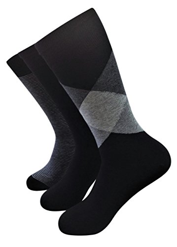 -. Feature : 3 pairs of dress socks made from premium combed cotton / One plain, one striped, one argyle pair / Crew-length, ribbed cuffs, goes to mid-calf / Smooth hand-linked toe seam / Machine washable, imported