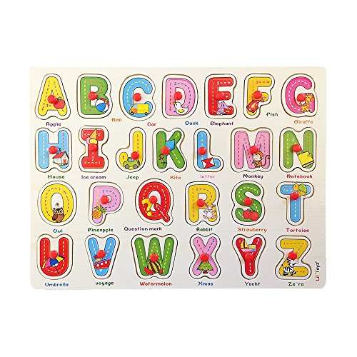 -. Binding : Toy -. Brand : Lil Toyz -. EAN : 0860260000277 -. Feature : 26-piece English Alphabet puzzle / Pictures starting with the letter / Lightweight and sturdy wooden construction / For 3+ Yrs. Contains small parts. / Dimensions: 11.75" x 8.75" x .25" -. IsAdultProduct : 0 -. Label : Lil Toyz -. Manufacturer : Lil Toyz -. ProductGroup : Toy -. ProductTypeName : TOYS_AND_GAMES -. Publisher : Lil Toyz -. Studio : Lil Toyz -. Title : Lil Toyz Alphabet Picture Wooden Peg Puzzle -. UPC : 860260000277