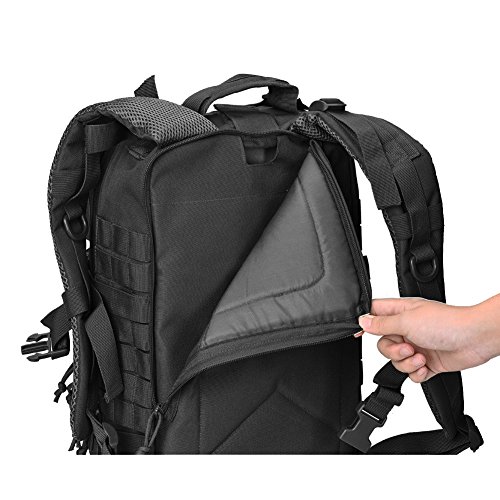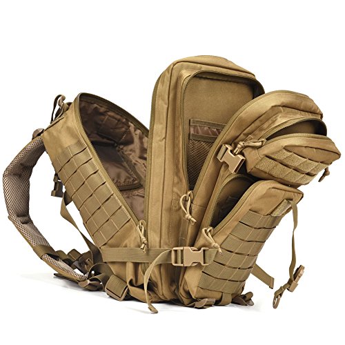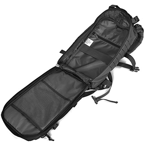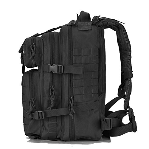 -. Feature : Military tactical backpack has molle system, it's new design MOLLE that is little different as most tactical bacpkacks and is not to spec. / 34L Small Tactical Assault backpack, size approx.:W11"*H18"*D12"; Military backpack is made of High Density fabric, durable and water-resistant / Military backpack has hydration compatible that works great for a hydration bladder (backpack don't include hydration bladder) as outdoor tactical or camping hydration backpack. / Assault pack backpack with double-stitched and heavy duty zippers. Side and front load compression system, Ventilated mesh padded back area & shoulder strap,breathable and comfortable. / This tactical assault pack backpack can be used as 3 day assault pack, bug out bag backpack, range bag, hunting backpack, survival backpack, army backpack, go bag or day pack for work or daily use.