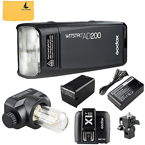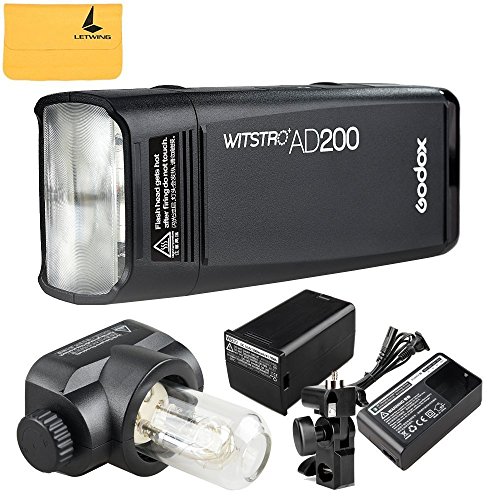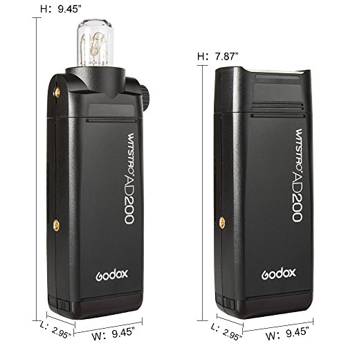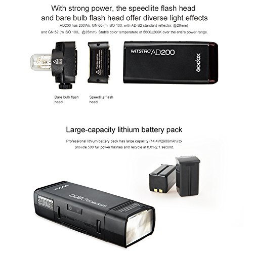 Specifications: Model: AD200 Wireless slave mode: radio transmission mode (compatible with Nikon Sony Canon) Flash mode: Wireless off (slave unit of radio transmission) - M / Multi (TTL / M / Multi) Compatible cameras under radio transmission (as slave unit): Nikon (X1N as master unit), Sony (X1S as master unit), Canon (X1C as master unit) Guide number (1/1 output): Flash light Flash head 52 (m ISO 100, @ 35mm), incandescent lamp Flash head 60 (m ISO 100, with AD-S2 standard reflector, @ 28mm) Flash duration t0.1 (approx.): Flash light Flash head / light bulb Flash head (1/220 to 1/13000 seconds) Power: 220W Power output: 8 levels (1/128 ~ 1/1) Stroboscopic Flash: Offer (up to 90 times, 99Hz) Flash exposure correction (FEC): manual. FEB: - 3 stops in 1-3 steps. Synchronization mode: high-speed synchronization (up to 1 / 8000s), synchronization of the first curtain, synchronization of the second curtain. Delay flash: 0.01-30 seconds. Mask / Beep / Modeling Lamp (LED) / Flashing Light: Yes Optical slave flash: S1 / S2 Wireless flash (2.4G transmission) Wireless Flash Function: Slave, Off Controllable slave groups: 5 (A / B / C / D / E) Transmission range (approx.): 100m Channels: 32 Power supply: Power supply: Lithium battery (14.4V / 2900mAh) The full power flashes: 500 Recycling time: Approx. 0.01-2.1s Battery indication: YES Power indicator: After about 30 minutes idle mode, automatic power supply. Sync Shutter mode: 3.5mm sync line, wireless control port. Color temperature: 5600 -200K Dimension: 168 * 75 * 500mm (Flash Head not included) Net weight: 560g (flash head and battery not included) Package includes: 1 x AD200 flash 1 x X1T-O 1 x LETWING Cloth 1 x Flash light flash head 1 x Incandescent lightning head 0