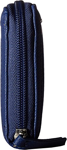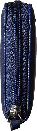 Lined interior features one zip pocket, an ID window, card slots, and currency slip pockets.