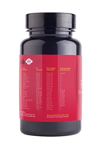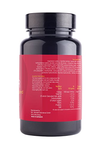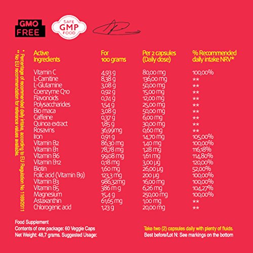 Ingredients: magnesium oxide, L-Carnitine tartrate, Capsule shell: hydroxypropyl methylcellulose (plant), ascorbic acid, iron (II) citrate, L-Glutamine, Ginkgo Biloba extract (24% flavonglycosides), Godji extract (50% polysaccharides), organic maca powder, Guarana extract (12% caffeine), green coffee beans extract (50% chlorogenic acids), quinoa extract, Rhodiola extract (3% Rosavins), Haematococcus Pluvialis algae extract (5% astaxanthin), nicotinamide, coenzyme Q10, calcium d-pantothenate, cyanocobalamin, pyridoxine hydrochloride, thiamine hydrochloride, riboflavin, folic acid, biotin.Contains caffeine.