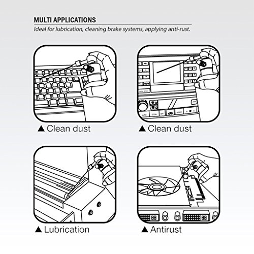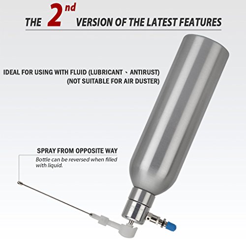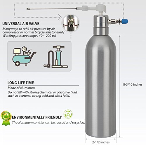 -. Feature : Refill pressure with universal adapter for easy to stuff air pressure, comes with a tool stand. / Provide with the safety valve on the air inlet set. pre-setting 90 Psi(6.3Bar); The exceed pressure will be release automatically. / With long type nozzle for narrow and difficult space. / Ideal for using in lubrication, anti-dust, etc. / Aluminum canister for long life use. Made in Taiwan with high quality.