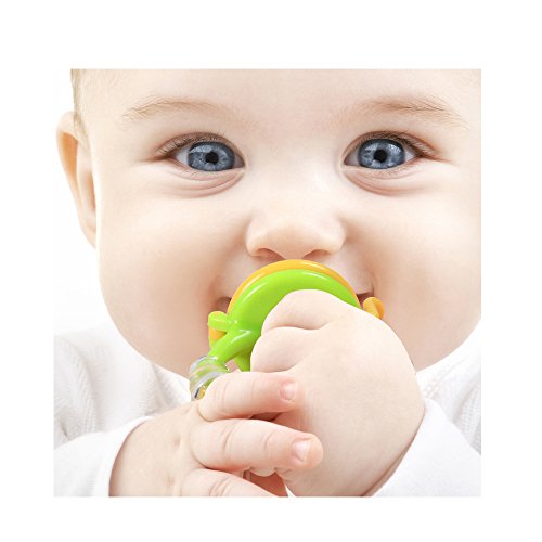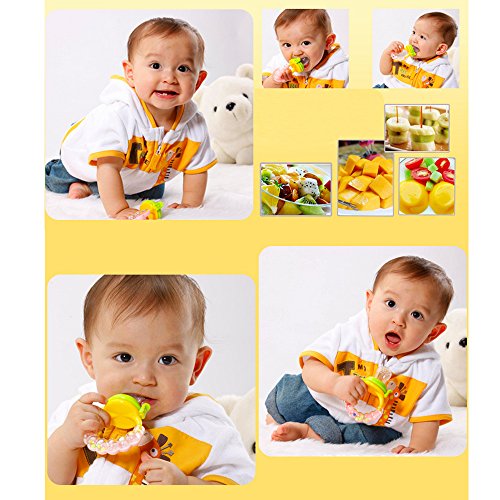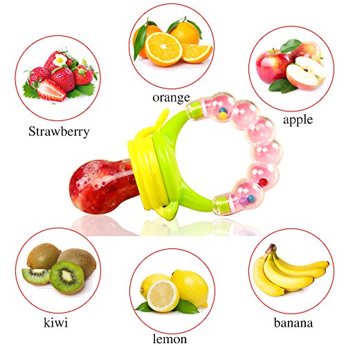 -. Feature : ★Safe and High Quality Baby Food Feeder-Made from the highest food grade silicone which is BPA Free, Lead Free, Petroleum Free, Latex Free and Phthalates Free. These baby fruit pacifier feeders are designed for teething baby boy and girl aged 6-12 months. / ★Fresh Food and Fruit Feeder- Parents can put a vast variety of fruits and vegetables,especially frozen breeding milk,strawberry,smashed banana in this food pacifier.And baby enjoy every delicious food and soothe teething pain,without chocking risk,which brings a new and pleasant experience to them. / ★Bright Colour and Ringing Handgrip-The food feeder handle has colorful beads and texture in it, which really help to hold baby's attention to it.baby are able to hold onto it by themselves and keep it in their mouth on their own, using the wide, easy grip handle.It exercise baby fingers flexibility and stimulate them to get food. / ★Easy to Clean and Hygiene-This feeder pacifier is a simple combination,so parents only wash it with warm soap water, or boil to sterilize.And it is convenient to carry it in travel or storage in fridge for its dust cover. / ★Perfect Baby Shower Gift-This is a considerate and sweet gift for your friends who have newborn baby.It is funny food feeder for baby to ease their teething.