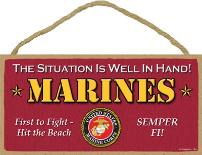 (SJT13074) U.S. Marines - The situation is well in hand! - First to fight hit the beach - Semper fi! Primitive 5" x 10" Wood Plaque Sign