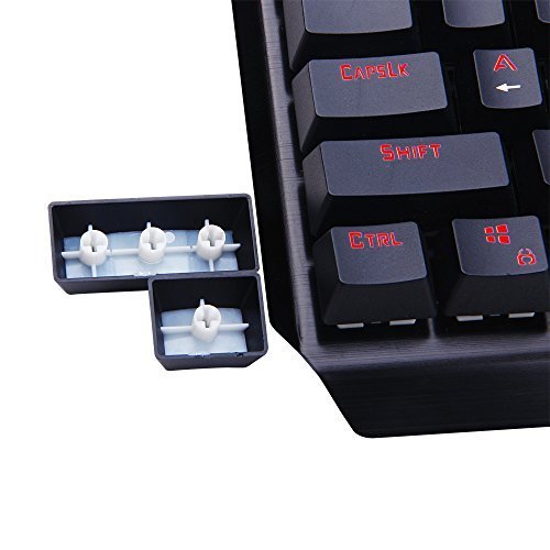 -. Feature : Custom mechanical switches (Cherry Green equivalent) for ultimate gaming performance / Red LED adjustable lighting and double-shot injection molded keycaps for crystal clear backlighting / Aluminum and ABS construction, plate-mounted mechanical keys, and gold plated USB connector stand up to hardcore gaming / Custom mechanical switches designed for longevity, responsiveness, and durability. Mechanical keys with medium resistance, audible click sound, and tactile feedback / 87 standard conflict free keys, 12 multimedia keys, and splash-proof design