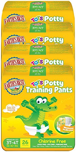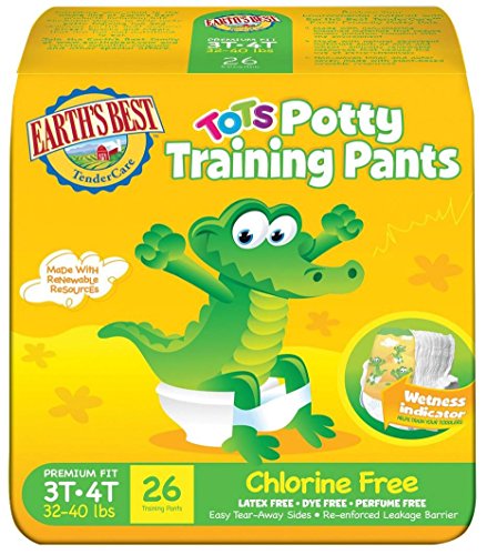 Earth's Best TenderCare Chlorine Free Tots Potty Training Pants These training pants come with stretchable waistbands to give your baby a comfortable fit and easy mobility. The best part about them is that they come complete with a wetness indicator. Also, these pants possess easy tear-away sides. Fits children 18-34 lbs. Why You?ll Love It: These training pants are made of annually renewable resources that can assist in lessoning the use of petro-chemicals.