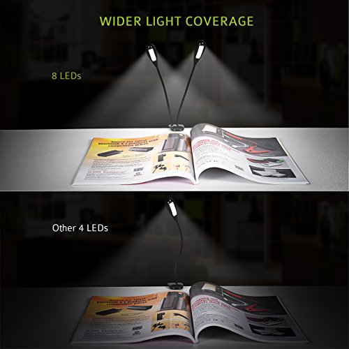 - 【2 BRIGHTNESS LEVEL & 8 POWERFUL LEDs】Built-in 8 LEDs, Dual heads, simple button control 2 levels of brightness as white light. Either lamp has 2 levels of brightness. The reading light is bright enough for reading at night and can easily light up 2 pages of book, notebook & anything else you'd like lit up.