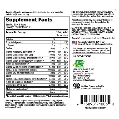 Yummy Bears Organics Multi Vitamin and Mineral is the best vitamin for your child's overall health. Its 16 essential vitamins and minerals contain the proper amount of nutrients which are important for your child's growth and development. Our Multi Vitamin and Mineral is specially formulated for your child so that it is Allergen-Free, Gluten-Free, Casein Free, has No Artificial Colors or Flavors and does not contain gelatin which makes it perfect for those who enjoy a vegetarian lifestyle.Feature