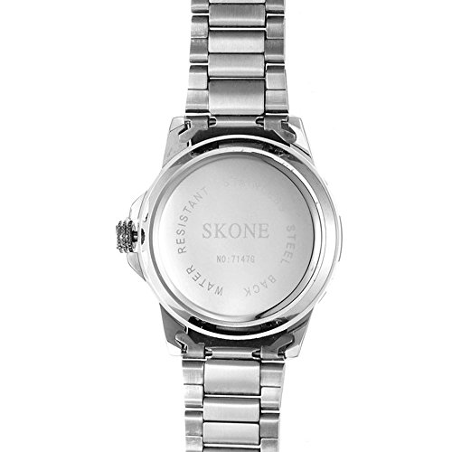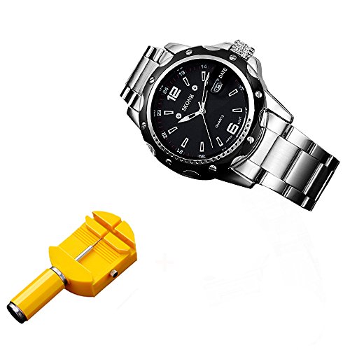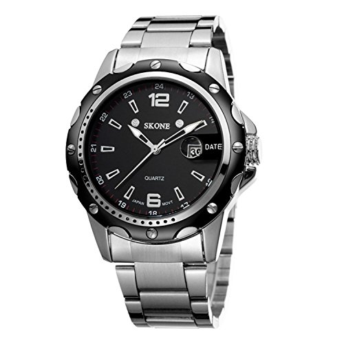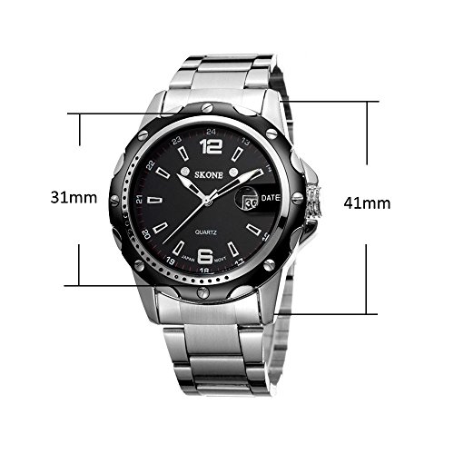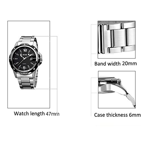 -. Feature : Black dial with magnifying glass,see the date clearly. / The band is made of stainless steel,soft and durable to wear. / Superior electroplating case,high quality and not easy to fade. / Hardness glass,scratch resistance and abrasion resistance. / The pointer is luminous,make you check the time conveniently at the night or where the light is weak.