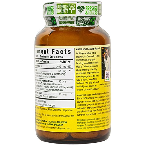 -. Binding : Health and Beauty -. Brand : MegaFood -. Feature : FoodState vitamin C provides an array of immune supportive compounds for life / Helps maintain an already healthy inflammatory response / Full spectrum of age-defying antioxidants from colorful whole foods and herbs provides added immune support / Naturally buffered and gentle on the stomach -. Label : MEGAFOOD -. Manufacturer : MEGAFOOD -. PackageQuantity : 1 -. ProductGroup : Health and Beauty -. ProductTypeName : HEALTH_PERSONAL_CARE -. Publisher : MEGAFOOD -. Studio : MEGAFOOD -. Title : Ultra C-400