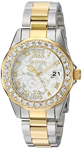 Invicta 22871 Disney Limited Edition women's dive watch features a 38mm wide two tone yellow gold plated solid stainless steel case with crystals accented fixed bezel and textured push-pull crown. Invicta 22871 is powered by Japanese TMI PC32A quartz movement. This beautiful watch also features a textured 20 crystals accented silver tone dial with beige accents gold tone luminous hands and Roman numeral hour markers along with the date display function, scratch resistant mineral crystal and water resistant to 200 meters. Invicta 22871 is equipped with an 18mm wide two tone yellow gold plated solid stainless steel bracelet with a fold over safety lock clasp. Invicta 22871 women's Disney Limited Edition silver tone dial two tone steel crystal dive watch is brand new and comes in an original Invicta gift box and is backed by a 5 year store limited warranty.Feature