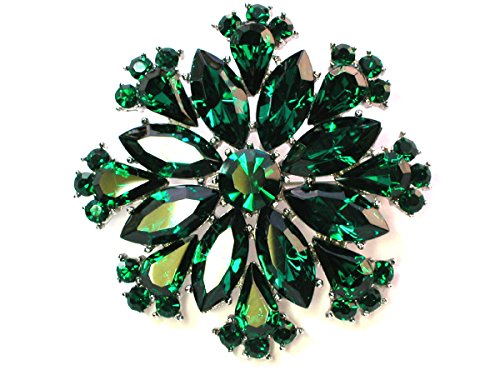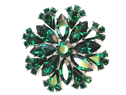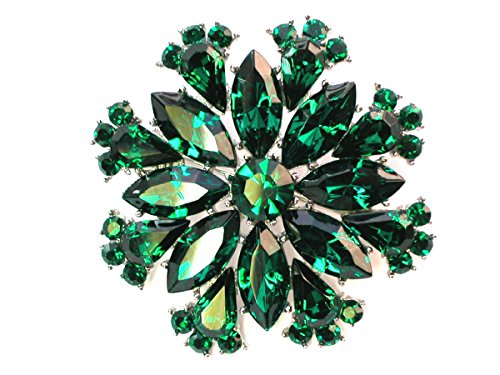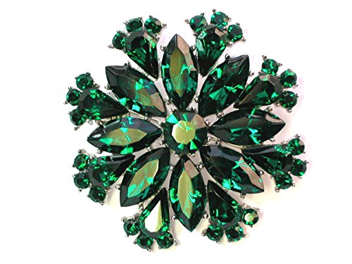 -. Feature : Materials: Rhinestone crystals / Color: Emerald color green / Type: Brooch / Pin / Alloy metal: Rhodium plated / Size: 2" in diameter.