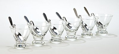 -. Feature : Ideal for a dessert or a buffet table / Miniature glass bowls with a conical design / Includes bent spoons that hugs the rim / Bowls measures 2.5" / 12 piece set. 6 Glass bowls; 6 Stainless steel bent spoons